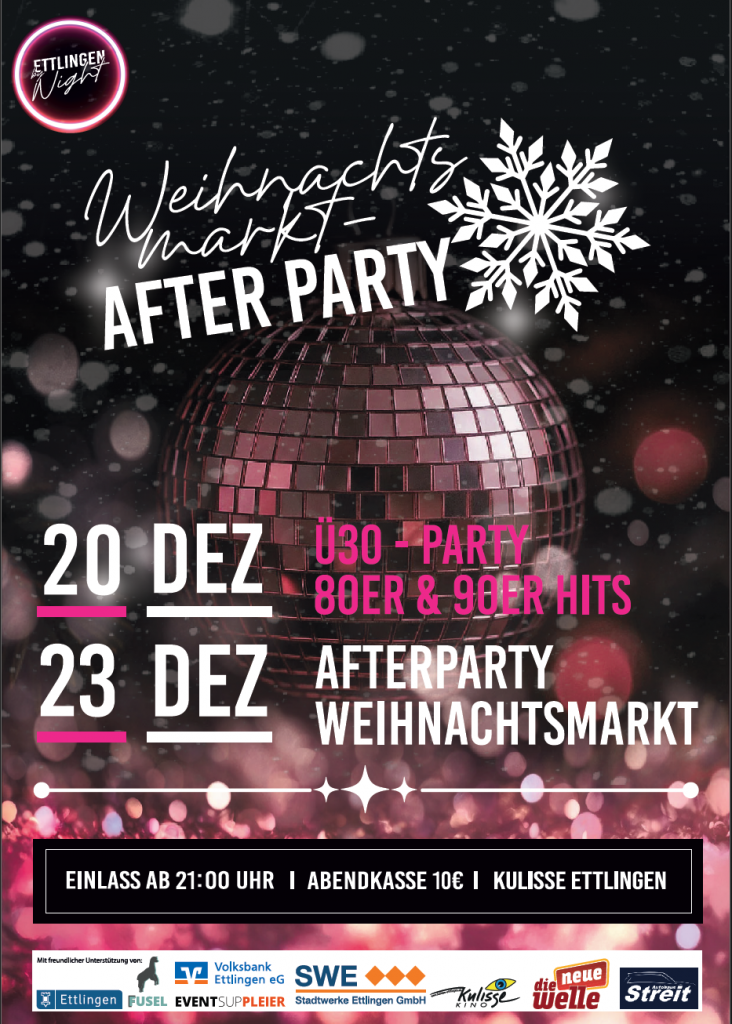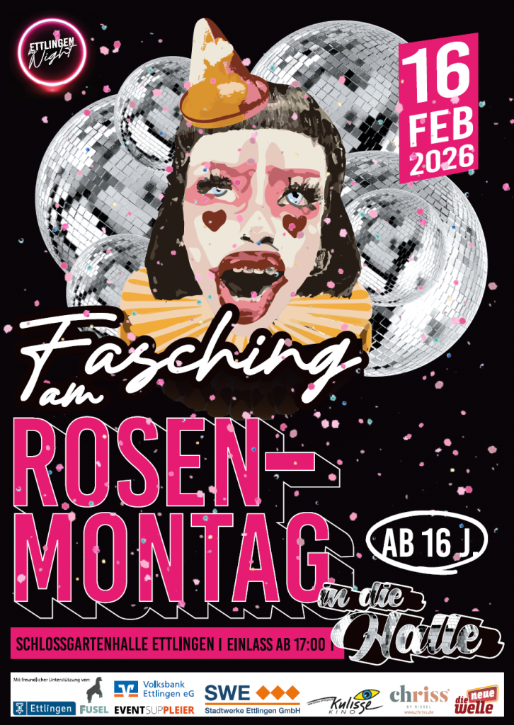 events Veranstaltungsübersicht Upcoming ... Weihnachtsmarkt Afterparty 20. + 23.12.2025 Kulisse Ettlingen. Für mehr Infos hier klicken. In die Halle - Schmudo Do. 12.02. Schlossgartenhalle Ettlingen. SCHMUDO In die Halle - Rosenmontag Mo. 16.02. Schlossgartenhalle Ettlingen ROSENMONTAG Vergangen: Open AIR Silent Disco 30.04.2025 Schlosshof Schloss Ettlingen. Für mehr Infos hier klicken. Marktfest AfterParty 29. + 30.08.2025 Kulisse Ettlingen. Für mehr Infos hier klicken. Halloween Party 31.10.2025 – Schlossgartenhalle Ettlingen. Für mehr Infos hier klicken.