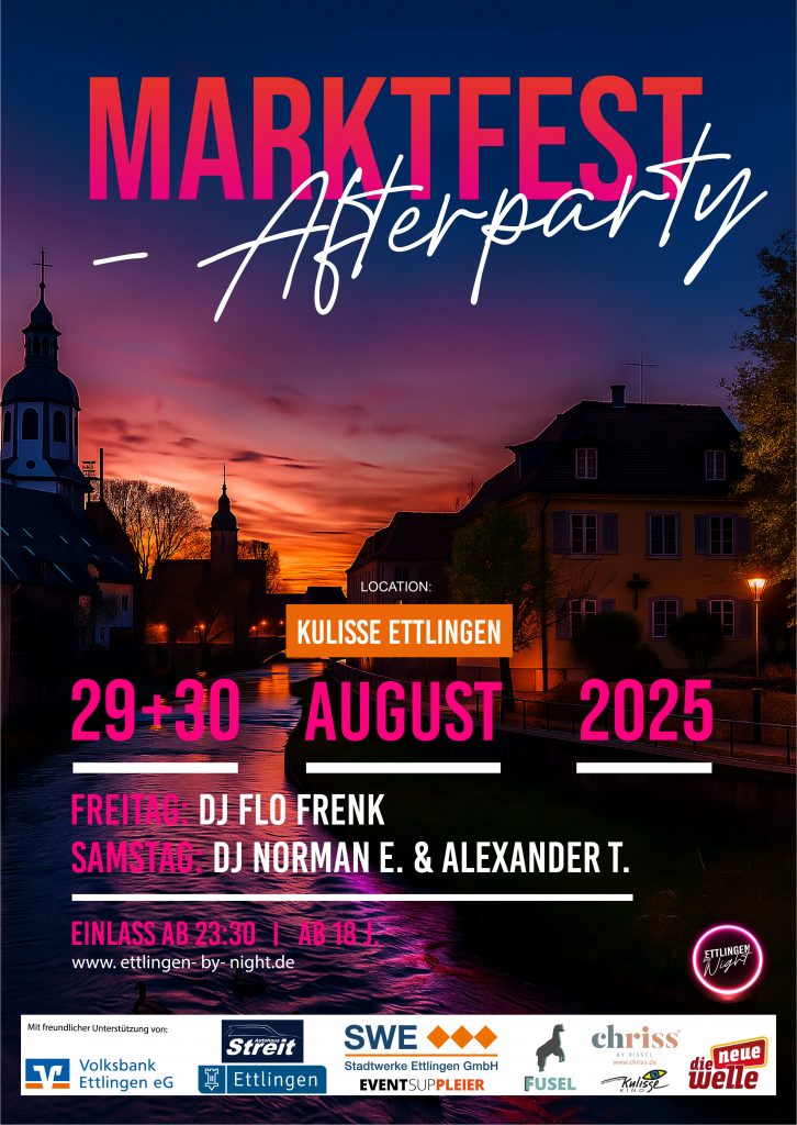 Genauso wie das Fest selbst ist die Afterparty im Anschluss mittlerweile eine feste Ettlinger Institution. Die Veranstaltung ist seit dem Jahr 2023 auch Teil und zugleich Flagschiff-Event des Projekts „Ettlingen by Night“.